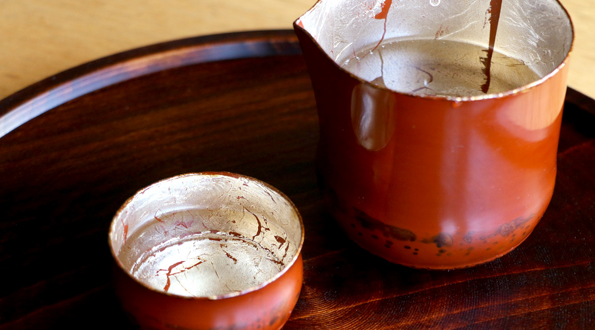 銅の素地に漆を塗り、その上に銀箔を施した「銀箔仕上げの酒器」。