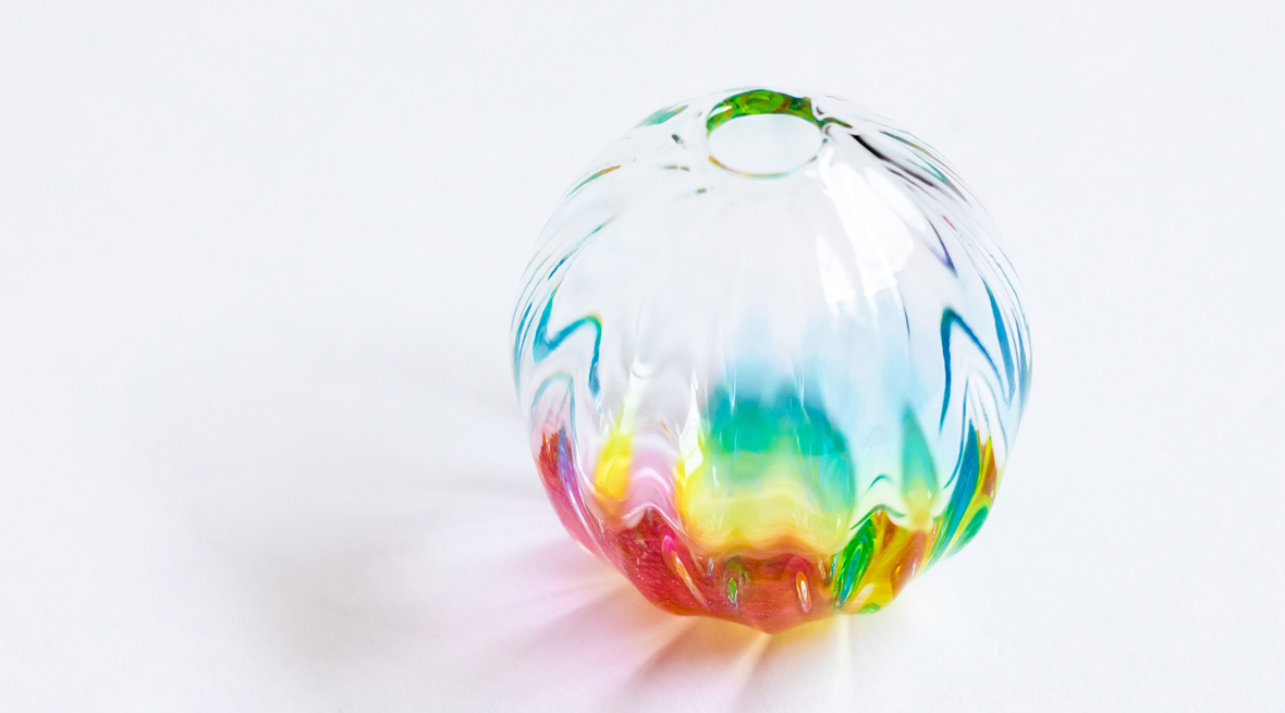 ガラス作家竹田舞由子さんの、透明なガラスの底に淡く美しい虹がかかる「にじ光(ひかり)」のシリーズ。